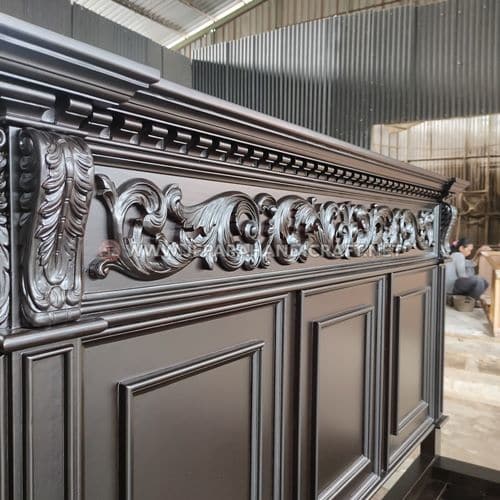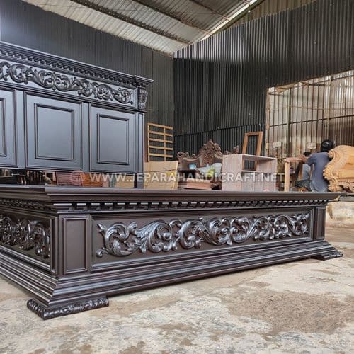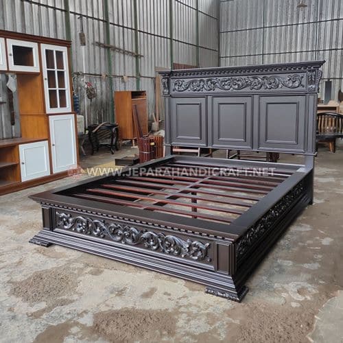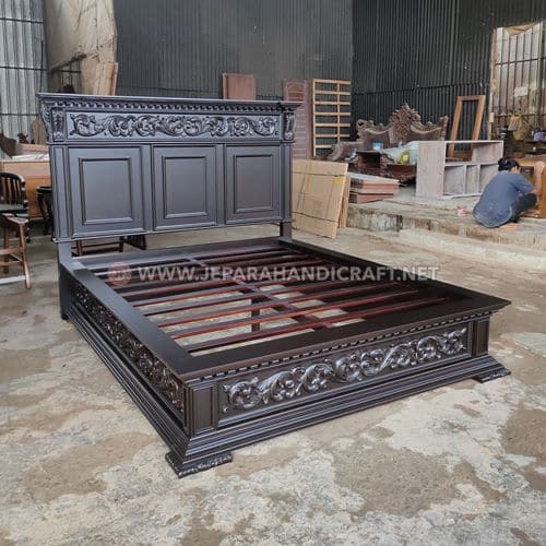 Setiap detail ukiran Jepara pada headboard dan footboard dikerjakan secara teliti oleh tangan-tangan pengrajin ahli, menghadirkan motif Wijayakusuma yang sarat makna tentang keagungan dan keanggunan.